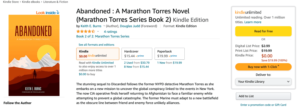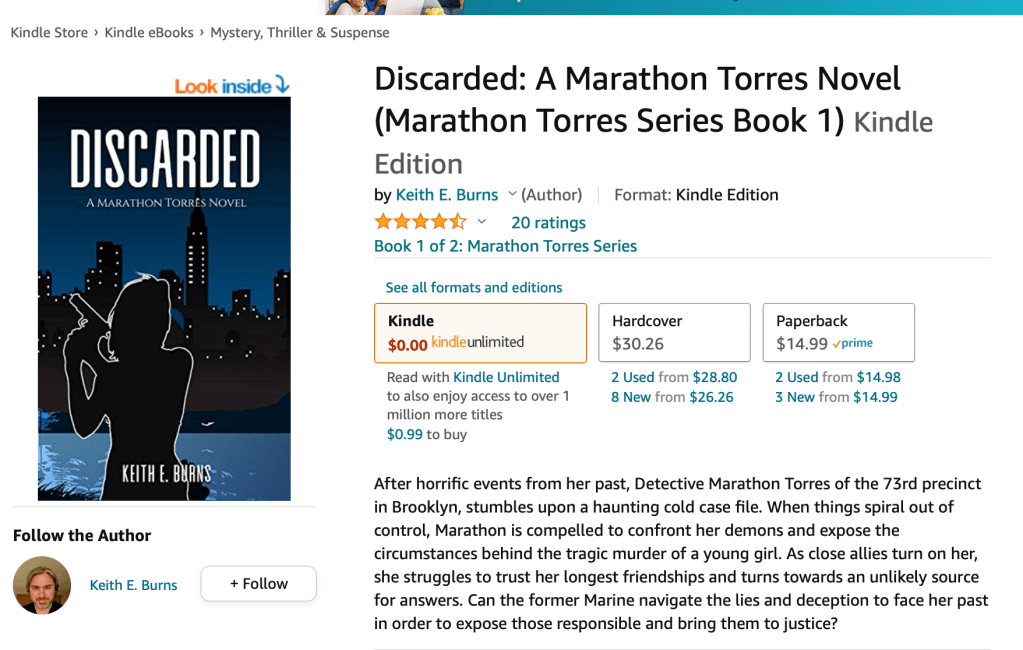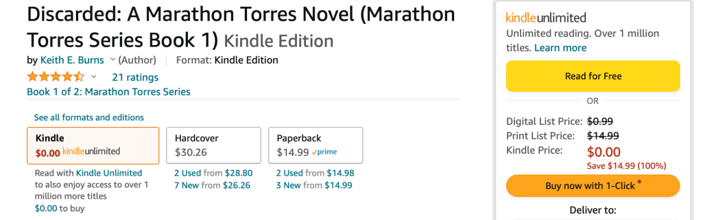 Discarded: A Marathon Torres Novel is on sale for FREE!!!! That’s right, the ebook-kindle version is now free for a limited time! Get it now, enjoy it later!